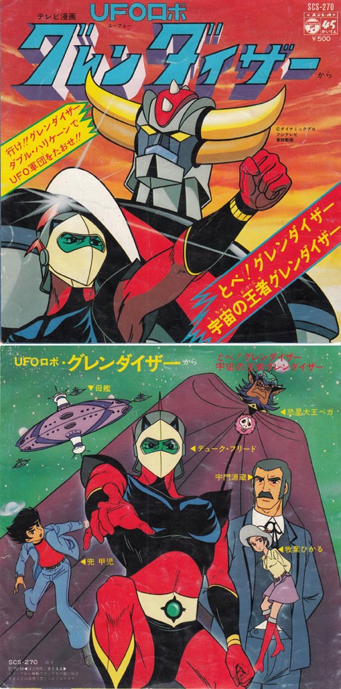 一応曲名はとべ!グレンダイザーです。ささきいさおさんですね。当時はグレートマジンガーの次でかなり期待したら、UFOだったし、主人公はデュークフリードとかいう異星人だし。UFOとマジンガー合体かぁと。でも結構長くやってたよなぁ。兜甲児も出てたけどいまいちだったし。2枚目に出ている牧葉ひかるさんは最も人気のないヒロインだと書いてありました。キュロットスカートにハットをかぶってますもんね。途中で出てくるグレース・マリア・フリードの引き立て役か?