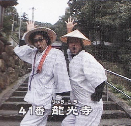 | 41番札所 龍光寺 「今日はとりあえず41、42、43と、3つやって終わりにするから」と藤やん。「数珠を無くしてだ、藤村君。この夜中だ。ひと寺でひとり連れてきたって3人乗るぞ。もう乗れないよ。幾分狭いよ。酔い止めもかわないぞ、もう。飲んだらその薬はオレらには効き過ぎるなんつって寝てだ、タレントにだよ、重たいデジカムをぶつけてきてだ。1日たってまだ効いてるなんていってだ。こっちは一生懸命急カーブをだよ、ハラハラしながら運転してる、その僕にだ、ご苦労さまというならまだしもだよ。カメラをぶつけてくるってのはどういうことだ。」とぼやいてついた先は人ん家の前。犬の吠えながら龍光寺って言ってました。画像は「りゅう、こう」とピンクレディのUFOのまねをしているお二人ですけど。 |