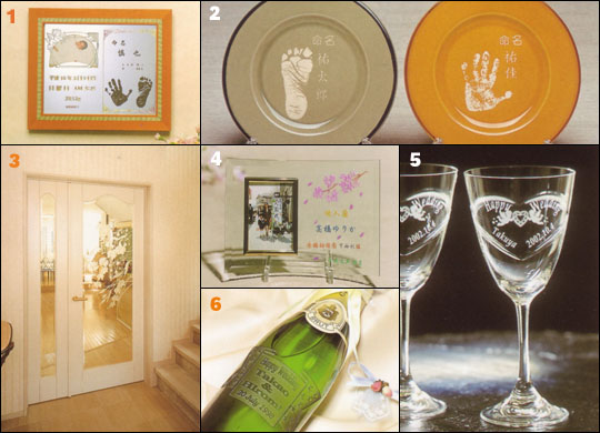 | 1:四つ切アルミフレームに彫刻、2:手形足型を彫刻したお皿、3:ドアに彫刻、4:ガラスのフォトスタンド、5:ワイングラスに彫刻、6:ボトルに彫刻 |