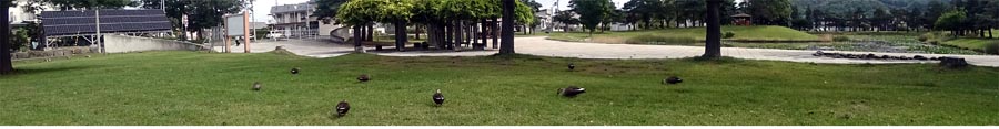 | 常盤公園。芝生の上に屯するカモ。写真左は北見西小学校、写真右が無加川の堤防側。 |