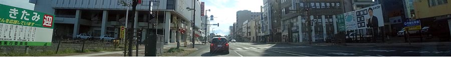 | 山下通りから学園通りへ。写真奥は北見藤高校、写真右が東宝ビル側。 |