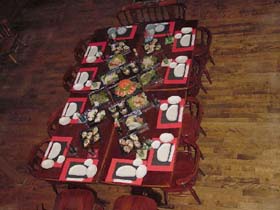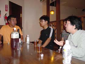 | 会場の2階には、こんなスペースもあった。宴会前のひとコマ。 左から西村さん、マツ、影にうめこさん、代表。 西村さんの“弟子”と“どれい”が一枚の写真に収まっている。 なんとも貴重な一枚。当然、二人とも正座してお話を承っていた。 樺さんのナイスショット。 |