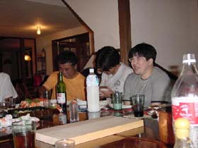 料理がないということは、ひとしきり食べた後。 右から、ゆかさん、t2t2、西村さん。 t2t2から、婚約者とのなれそめを聞いている。 |