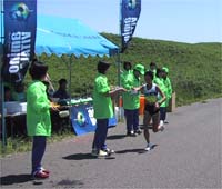 「90キロ地点」関門スタッフ。常呂中学校の2年生と先生。