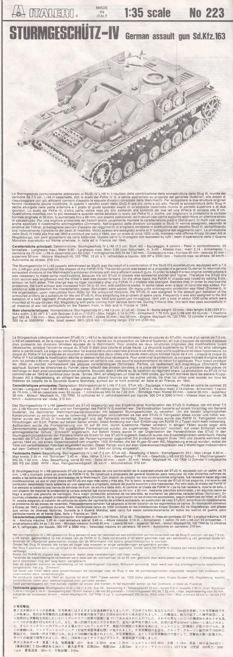 トミーさんとイタレリの合同プラモデル、ファイティング・ヴィークル・シリーズだと思われます。タミヤさんにもあります。タミヤさんは兵士が一人運転席から身を乗り出しているものです。2枚目にやっと日本語の説明があります。ツィメリットコーティングが施されたと書いてあります。シュルツェンもついてます。至れり尽くせり。