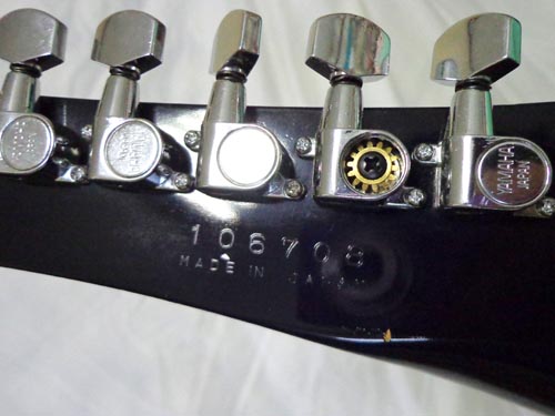 | シリアルナンバーを見てみましょう。10から始まるんで後期機種でしょうなぁ。しかし、ペグの裏蓋が外れてますな。さびてないけどマイナスポイント。傷も多いしね。 |