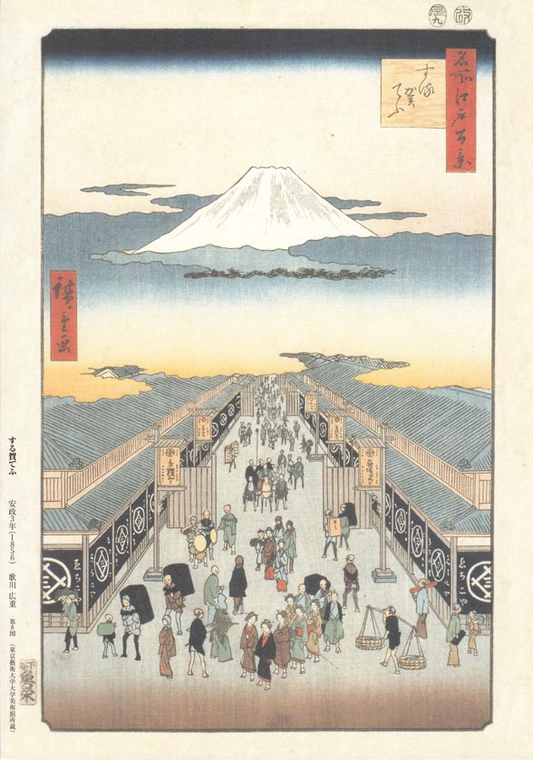 | する賀てふ する賀てふと書いて(するがちょう)って読むんだそうな。蝶々がてふてふ、って書かれるのも当然だわな。場所は中央区日本橋。両側にあるお店は三井越後屋さんですね。「越後屋、お主もわるよのう」って悪代官が言うあれです。まぁ悪いことをしたことはないと思いますけどね。これは一説によると、三井越後屋さんからオファーがあったのではないかと言われています。なにせお店が並び、人がいっぱいいて、後ろには日本一の富士山がデーンと。イメージ戦略ですね。ちなみに三井越後屋さんは名前を縮めて「三越」になったそうですよ。 |