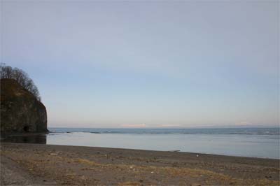二つ岩のオホーツク海。遠くに知床連山が見えます。