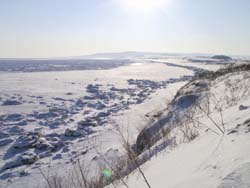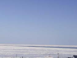 | 能取岬から知床連山を望む〜 2001.3.3 8:00 天気はいいのですが、写真で見ると逆光になるためにシラッ茶けてしまします。直に見ると、もっともっときれいなんですよ。かすかに知床連山も見えます。 いつものポイントからなのですが、いくたびに風景はその姿を変えますね。灯台をはさんで見える流氷は、手前は大きくごつごつしています。港のあたりは平坦ですが、その先の海の氷は細かくごつごつしているようにも見えます。近くまで行けばかなり大きいに違いありませんね。 遠くをみると流氷がさけて、海水がちょぴり顔をのぞかせています。かなり濃い色をしていて、マリンブルーよりももっと濃いですね。 |
