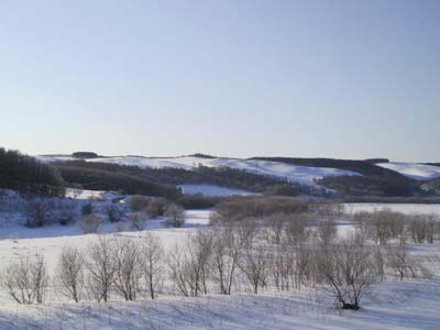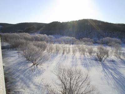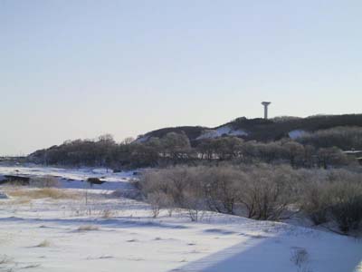 朝の風景で好きなポイントは、この常呂大橋から見る百年記念塔や農協牧場です。今日はシバレタらしく、「樹氷」がきれいに木々についていました。ここのところ朝方が暖かったので、今日の寒さは身にしみました(さぶぅぅ〜)