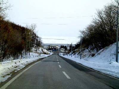| きょうのところ3 2001.3.20 6:30〜 さて、常呂漁港近くの丘の上にやって来ました。 朝方にここにくると風が急に冷たくなって、長い時間いられません。 ですから「ヤアッツ!」と気合を入れて、写真を撮ります。が、結構失敗します。やはりゆっくり構えて息をこらして撮るのがいいのでしょう。 赤灯台の色が、あざやかに朝日に映えていました。きれいです。 もう一枚は、百年記念塔から漁港へ向かう道路から、撮ってみました。 林と道路、その先の国道、民家、そして海、流氷。実際にはもっと、きれいです。 ここを走ると、一日気分がいいです。 |