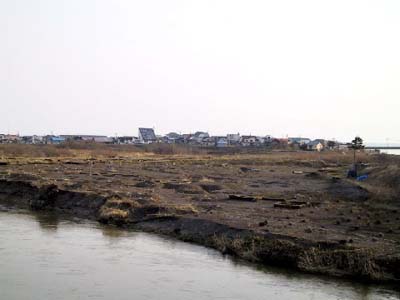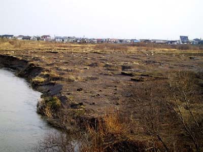 | 役場を望むと堤防の外側には雪捨て場があり、残雪の上に土が乗っていて真っ黒です。 |