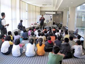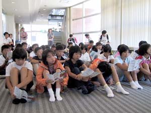 7日から岐阜県大野町の「大野っ子40名」が常呂町にやってきています。9日は、夏のカーリングホールを見学、長野五輪代表の近江谷さんの説明を熱心に聞いていました。