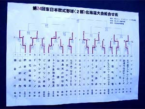 社会人の野球大会、第24回東日本軟式野球第2部全道大会が常呂町で24日から27日まで開催されました。 ふつう野球をプレーしているところをアップすべきでしょうが今回は舞台裏の風景を紹介します。 野球場裏手に陣取る審判控えテントには、その日の試合を 担当する審判員の名前が表示されています。試合を待つ審判員は前の試合を観戦しながら意見交換し審判終了後の試合を反省します。なかなか大変なんです、これが。 大会の組み合わせが表示されています。網走、美幌などの他球場からの結果も、このメイン球場に表示されます。 今日27日の決勝戦で、室蘭の「エアージン」が札幌の「北大理学部・ニュートレンズ」に勝利し、来年の東日本大会の北海道代表になりました。 |