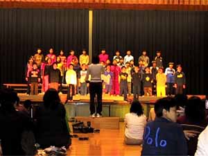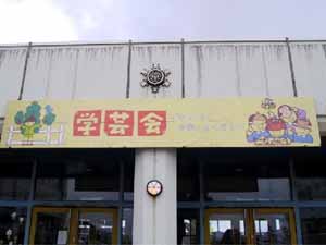 小学校の学芸会がありました。児童玄関には学芸会の看板が掲示してあり体育館の会場では6年生が合唱の発表をしていました。
