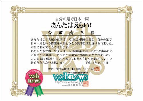 webnewsのオホーツク応援団より今田さんに贈られた完走賞。