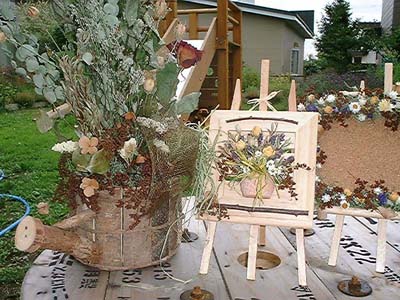 (左から、木のじょうろ花入れ、イーゼル2種)