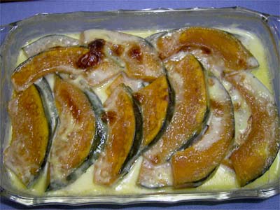 牛乳、生クリームをひたひたになるくらいに入れて砂糖、細かく切ったバターを上に散らす。 |