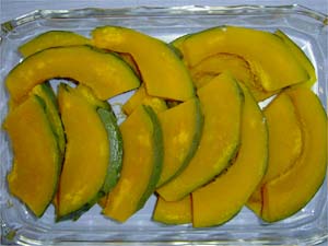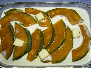 耐熱容器にバターを薄くぬり、薄切りしたかぼちゃを並べる。 |